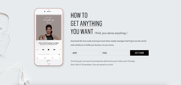 Этот сквиз пейдж предлагает бесплатный аудио-тренинг в обмен на mail пользователя. Она содержит профессиональные фотографии, текст и четкий CTA.