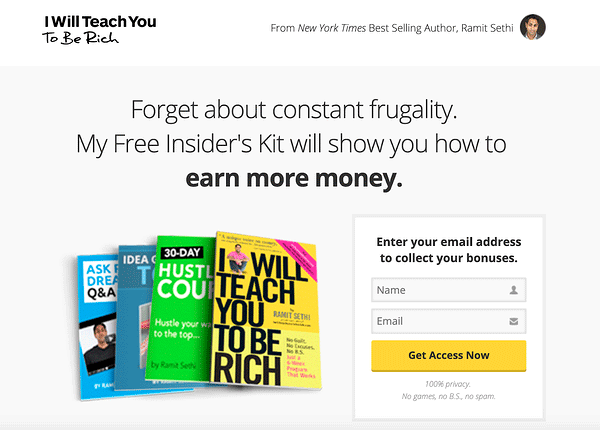 Этот сквиз пейдж давит на страх пропустить что-то интересное и важное, чтобы собирать мейлы. Заголовок страницы использует язык, включая «Free Insider's Kit», чтобы заставить пользователей почувствовать, что они находятся в ближнем круге автора, принадлежат к закрытому клубу.