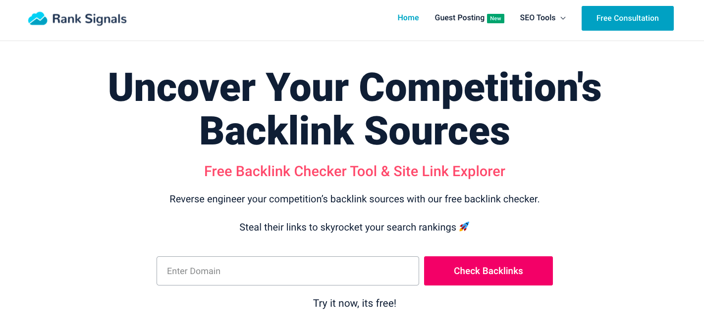 Rank Signals помогают вам определить обратные SEO-ссылки и источники трафика ваших конкурентов. Все, что вам нужно сделать, это ввести их домен, а Rank Signals сделает все остальное.