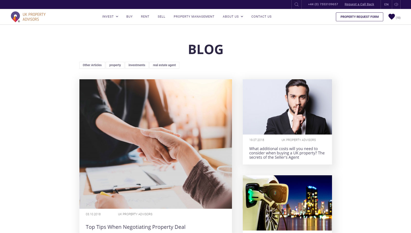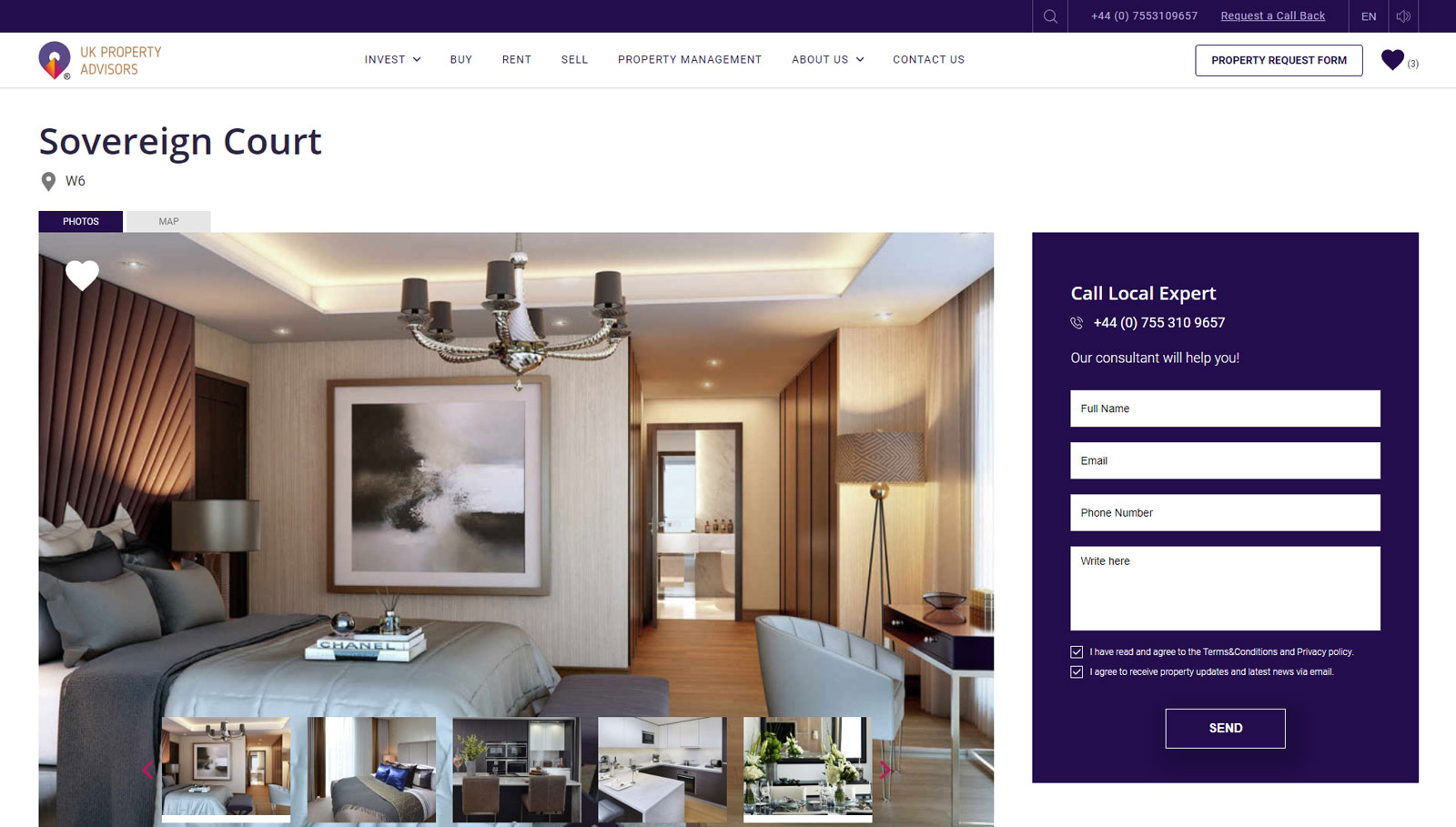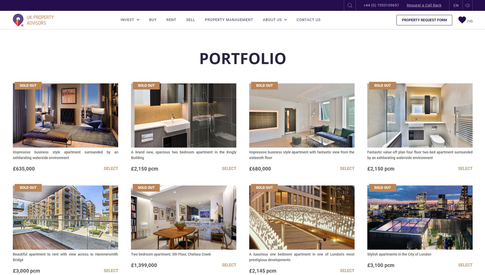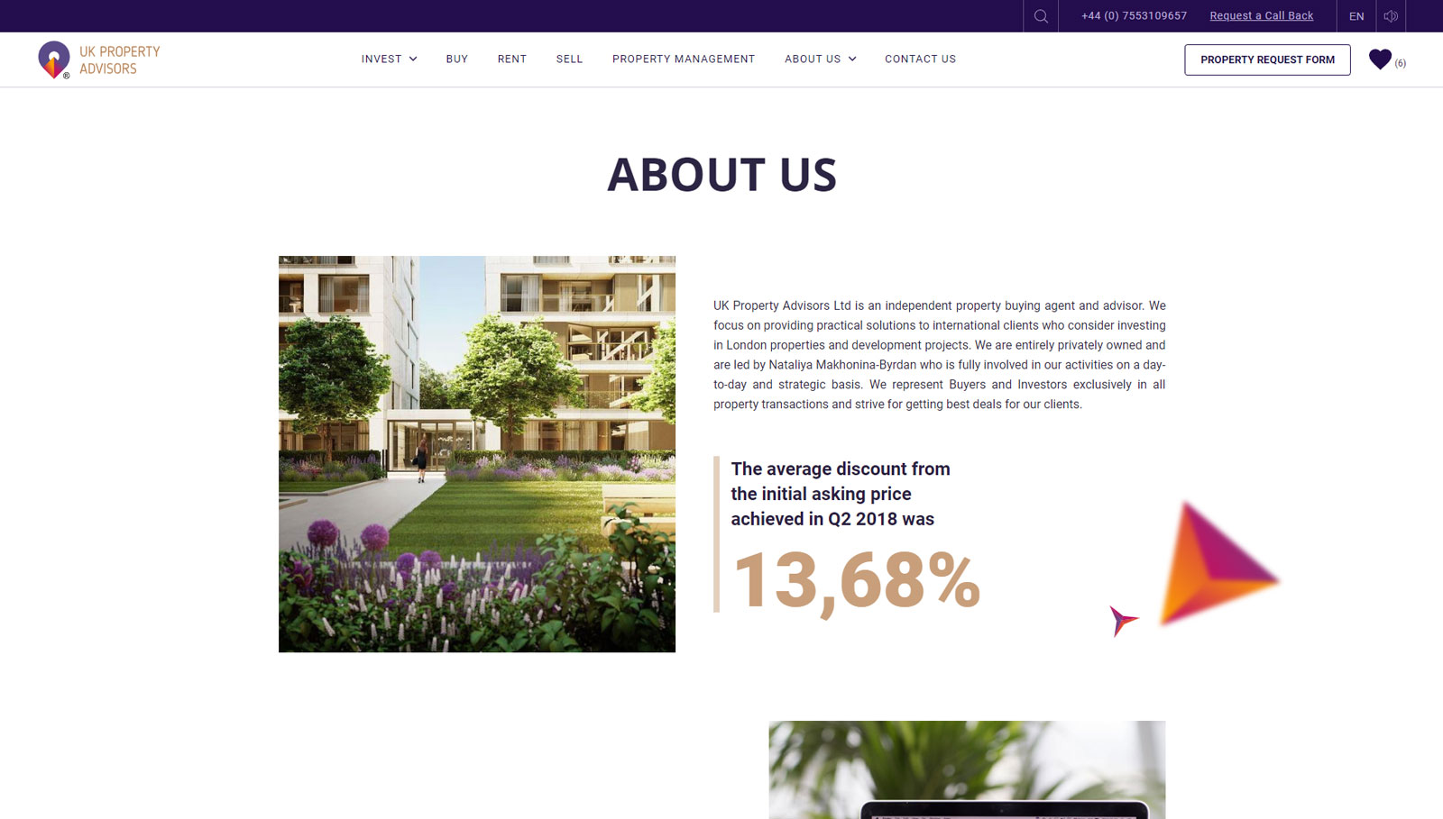 В результате совместной работы у риэлторской компании UK Property Advisors Ltd появился сайт 5-го поколения для продажи своих услуг на европейском, российском и казахском рынке, а также, на Ближнем Востоке. Имиджевый сайт с каталогом элитной недвижимости Лондона. С сайта менеджеру UK Property Advisors Ltd приходят заявки от инвесторов. Заявки обрабатывает отдел продаж. Административная панель сайта заточена под самостоятельное модерацию сайта сотрудниками UK Property Advisors Ltd.