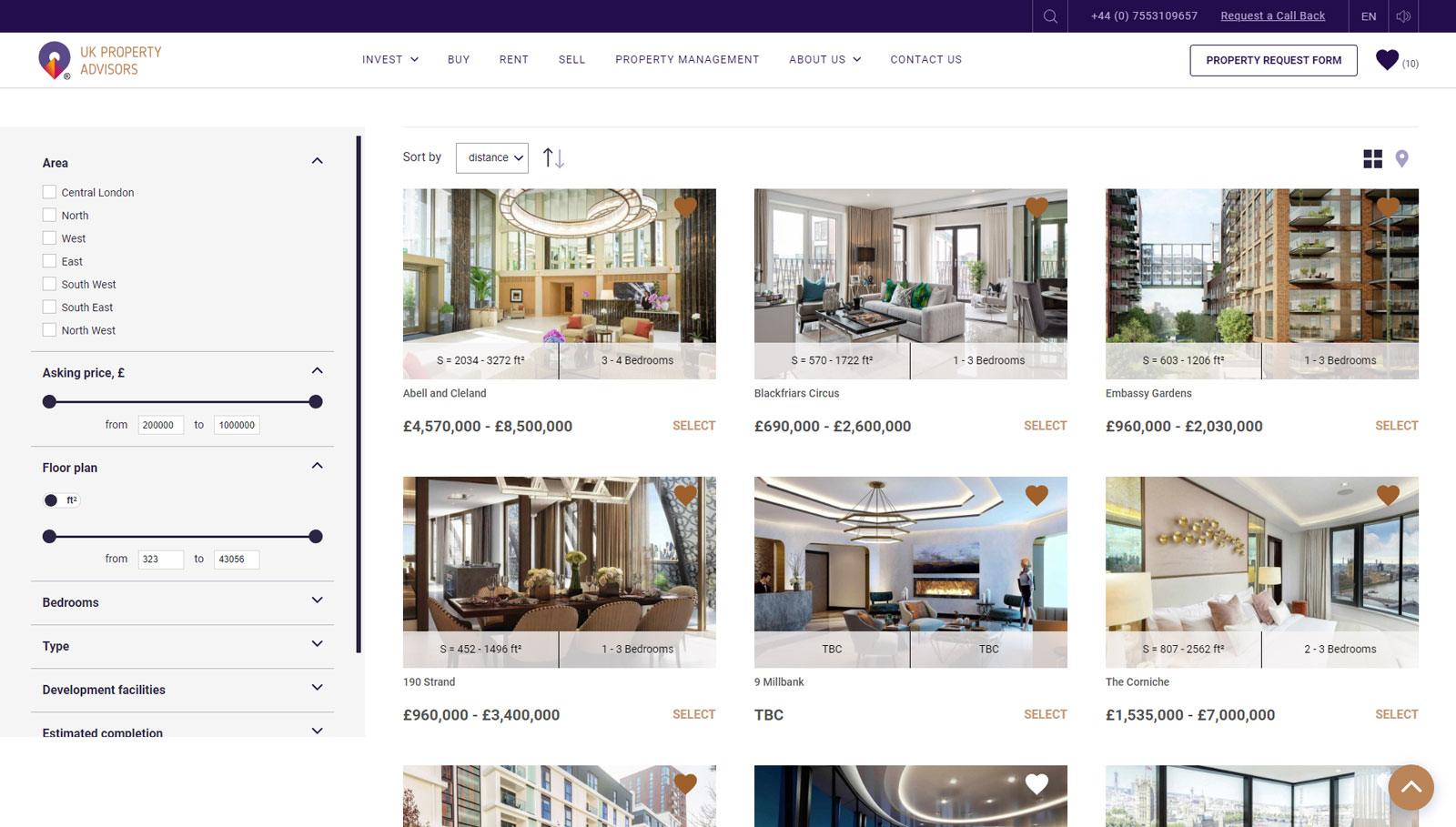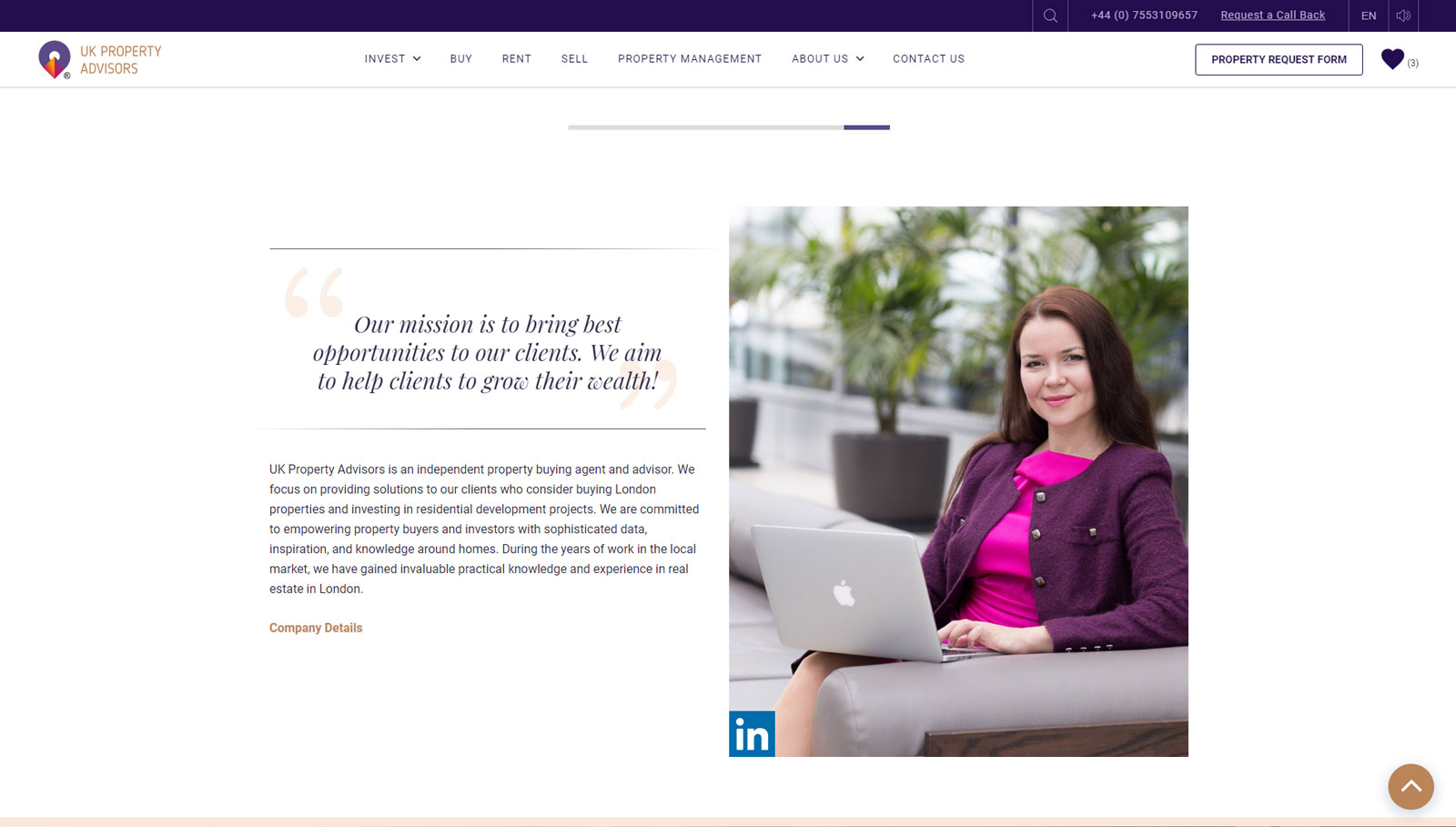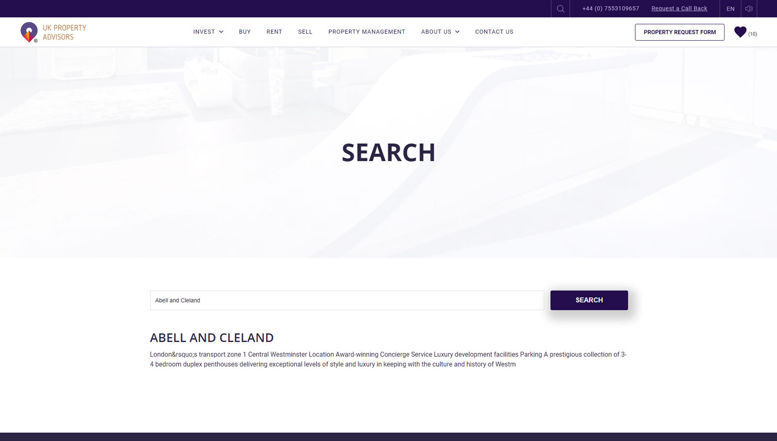 В результате совместной работы у риэлторской компании UK Property Advisors Ltd появился сайт 5-го поколения для продажи своих услуг на европейском, российском и казахском рынке, а также, на Ближнем Востоке. Имиджевый сайт с каталогом элитной недвижимости Лондона. С сайта менеджеру UK Property Advisors Ltd приходят заявки от инвесторов. Заявки обрабатывает отдел продаж. Административная панель сайта заточена под самостоятельное модерацию сайта сотрудниками UK Property Advisors Ltd.