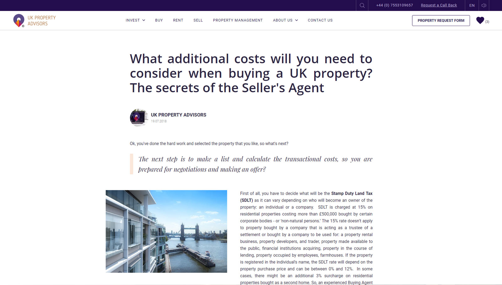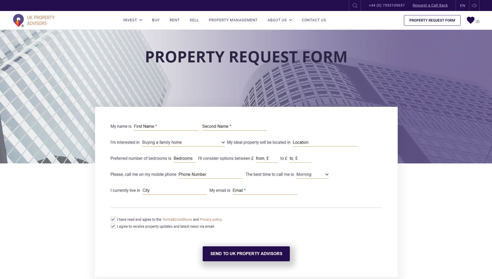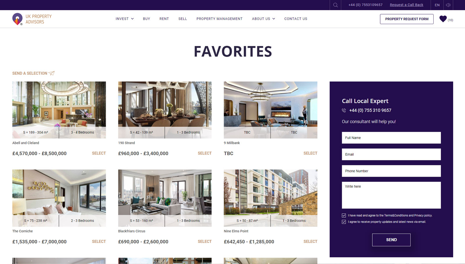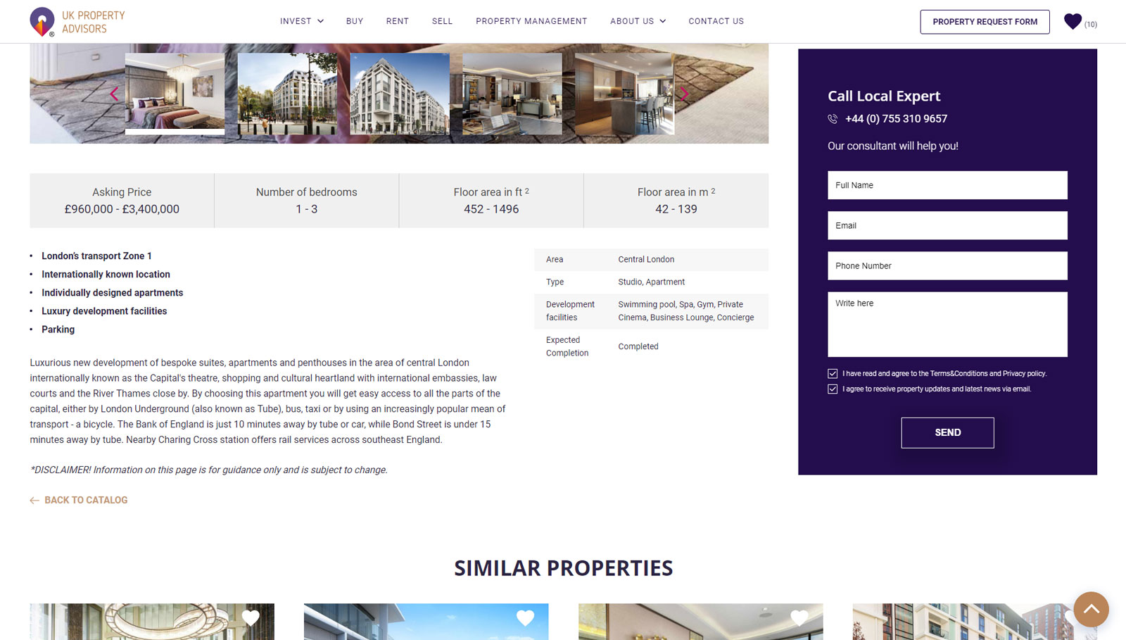 В результате совместной работы у риэлторской компании UK Property Advisors Ltd появился сайт 5-го поколения для продажи своих услуг на европейском, российском и казахском рынке, а также, на Ближнем Востоке. Имиджевый сайт с каталогом элитной недвижимости Лондона. С сайта менеджеру UK Property Advisors Ltd приходят заявки от инвесторов. Заявки обрабатывает отдел продаж. Административная панель сайта заточена под самостоятельное модерацию сайта сотрудниками UK Property Advisors Ltd.