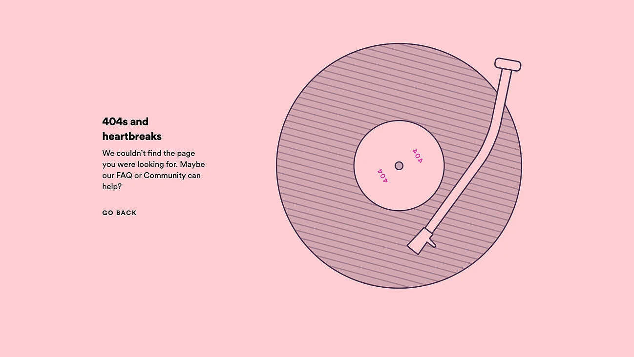 Гигант музыкального стриминга Spotify разместил на странице 404 остроумный каламбур из альбома Канье Уэста «808s and Heartbreak» и анимацию записи. Сайт развлекает, а затем отправляет посетителей обратно на страницу, с которой они пришли.