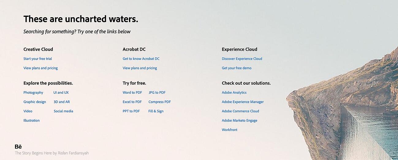 Как и следовало ожидать, страница ошибки 404 от Adobe полезна и визуально приятна. В нем перечислены популярные ссылки, которые могут понадобиться посетителям, а также интересные фото, служащие визуальной метафорой сломанной или потерянной страницы. Сайтам следует чаще использовать визуальные метафоры.