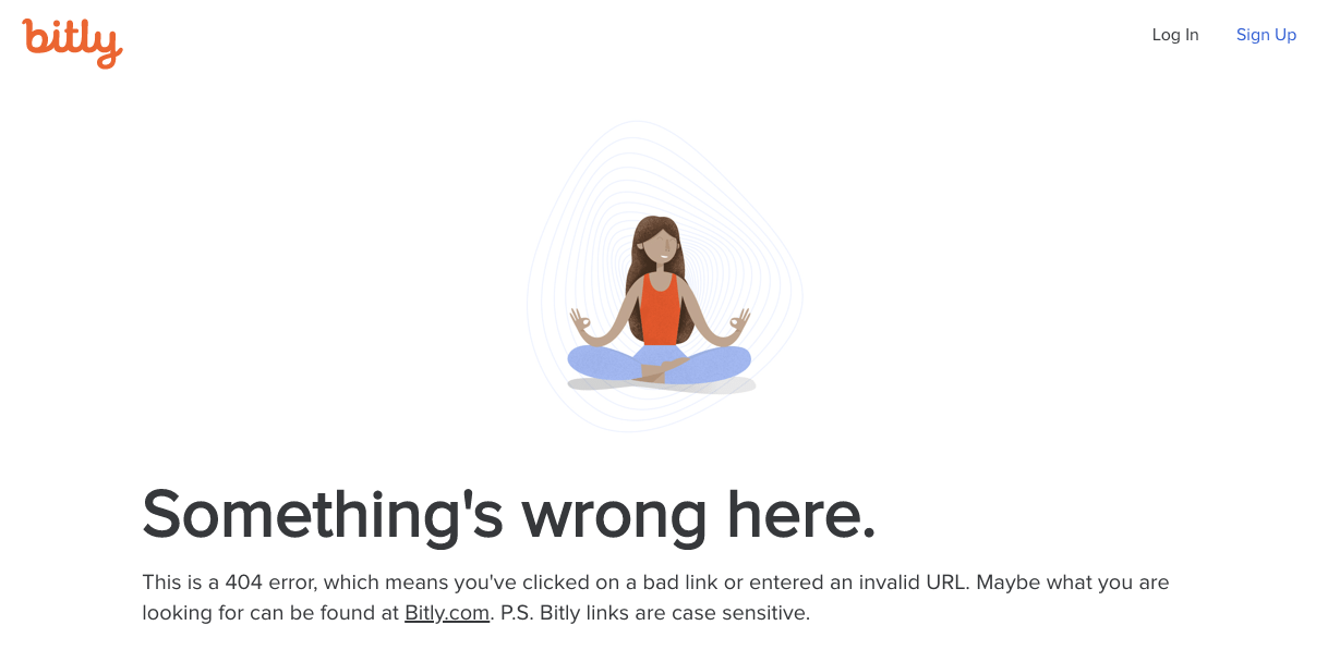 Если вы введете неправильную ссылку Bitly, вы попадете на страницу Bitly 404. Мы предполагаем, что это происходит довольно часто, поэтому страница 404 сразу переходит к делу. Он объясняет, что могло пойти не так, и предлагает пользователям идти на главную страницу Bitly, если им это нужно.