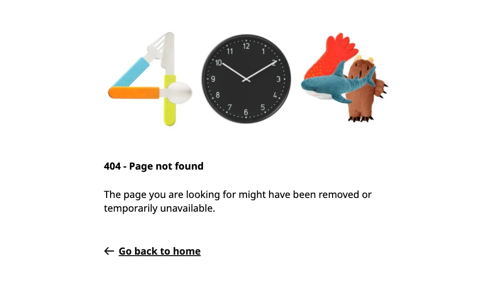 Страница 404 Ikea также минималистична, но умно офрмлена. Этот пример того, что ваши страницы с ошибками не должны быть сложными, и будет здорово, если они развлекают.