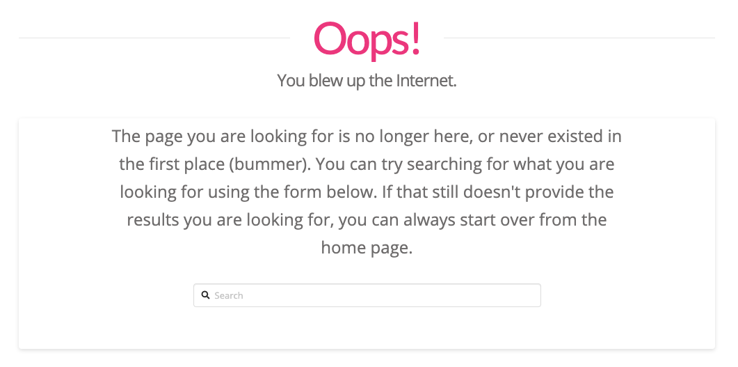 Конечно, фраза «взорвать интернет» может показаться немного преувеличенной, но она говорит посетителям, что Moxie Design Co. не относится к себе слишком серьезно с такими небольшими промахами, как этот. Кроме того, внизу удобно расположена панель поиска, чтобы вы могли выбраться.