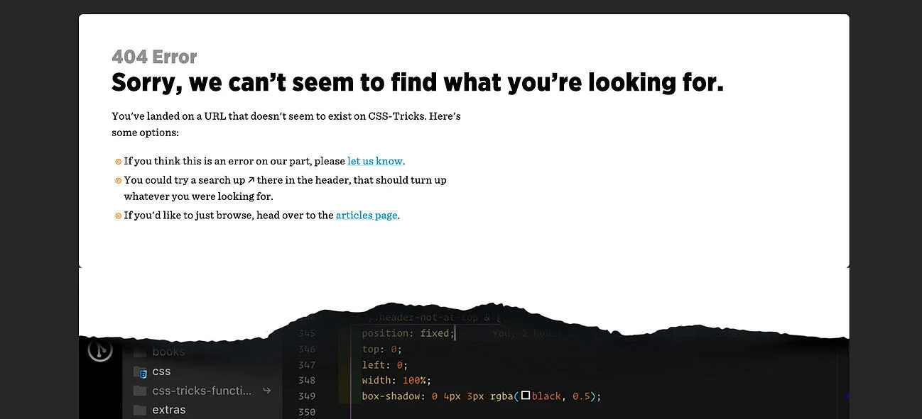 Вы когда-нибудь срывали обертку веб-сайта, чтобы посмотреть, что под ней? Это концепция, которую CSS Tricks использовали на своей странице с ошибкой 404. Это и остроумно, и напоминает о том, как устроен сайт.