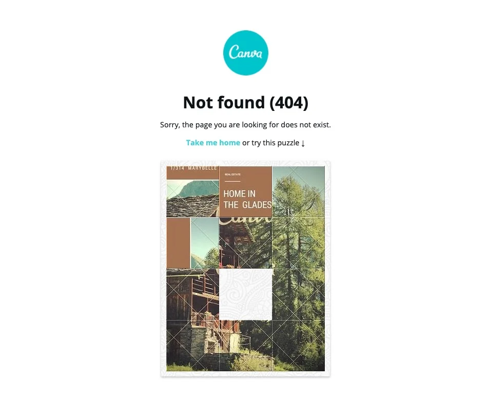 Взгляните на страницу 404 у Canva. Она сообщает об ошибке и предлагает головоломку, в которую посетители могут поиграть, чтобы немного развлечься. Нет ничего плохого в том, чтобы позволить вашим посетителям расслабиться на пару минут, верно?