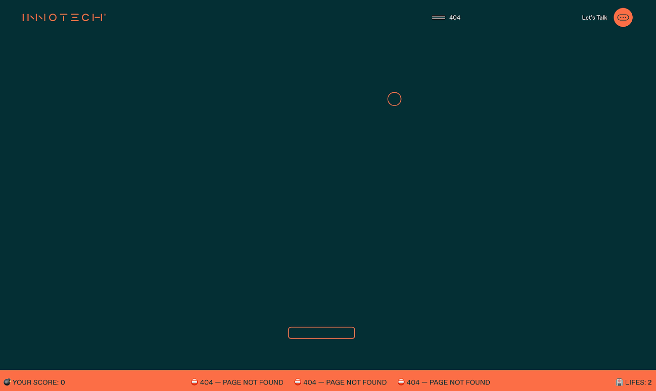 Подобно подходу Canva, Innotech разметила игру в стиле Pong на своей странице 404, чтобы немного развлечься. Скорее всего, вы запомните такой веб-сайт. А ещё у них впечатляющий веб-сайт — серьезно, когда вы закончите играть, перейдите на домашнюю страницу и изучите всё.