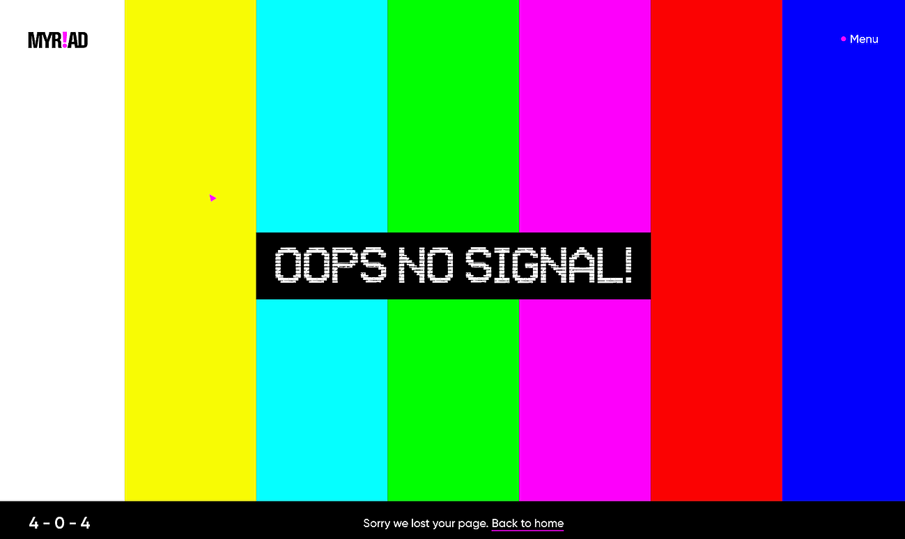 Видеоагентство Myriad выбрало причудливый фирменный дизайн страницы 404, имитирующий классические цветные полосы SMPTE, которые появляются на старых пленках и телевизорах. Это забавный отсыл к старым технологиям.