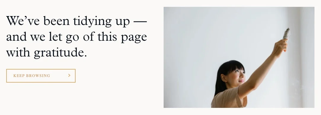 Известная своими популярными методами уборки, организации и своим брендом, Мари Кондо привнесла похожие ощущения на страницу 404 своего веб-сайта. Текст вкратце и с юмором возвращает нас к ее философии наведения порядка — небольшой, но хорошо продуманной детали, которую узнают фанаты.