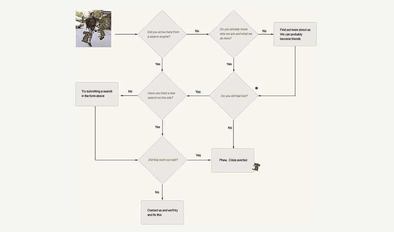 Если вы сообщаете об ошибке, почему бы не развлечь пользователя на несколько секунд, пока вы ему помогаете? После дружеского приветствия OrangeCoat предлагает блок-схему, которая фактически помогает пользователям понять, почему они вообще попали на страницу с ошибкой.