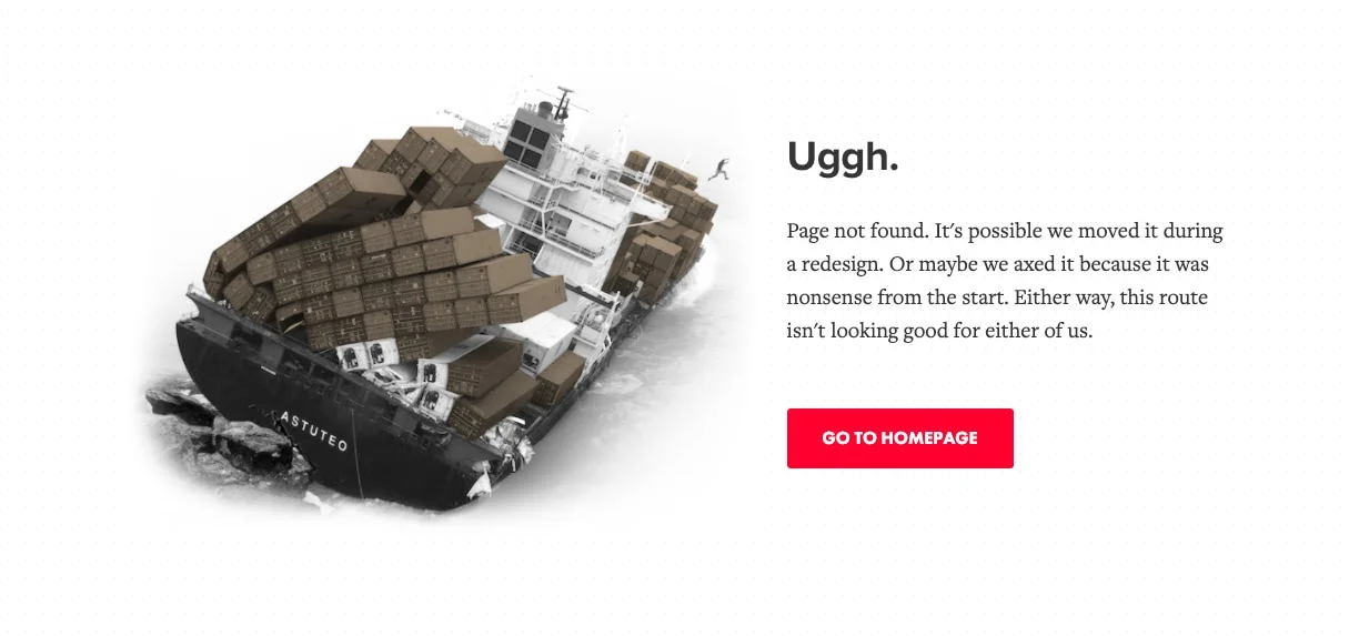 Страница 404 дизайн-агентства Astuteo — это идеальный баланс элегантной графики, юмора и пользы. Здесь есть необходимая информация и забавная визуальная метафора — тонущий грузовой корабль с убегающей фигуркой человека.