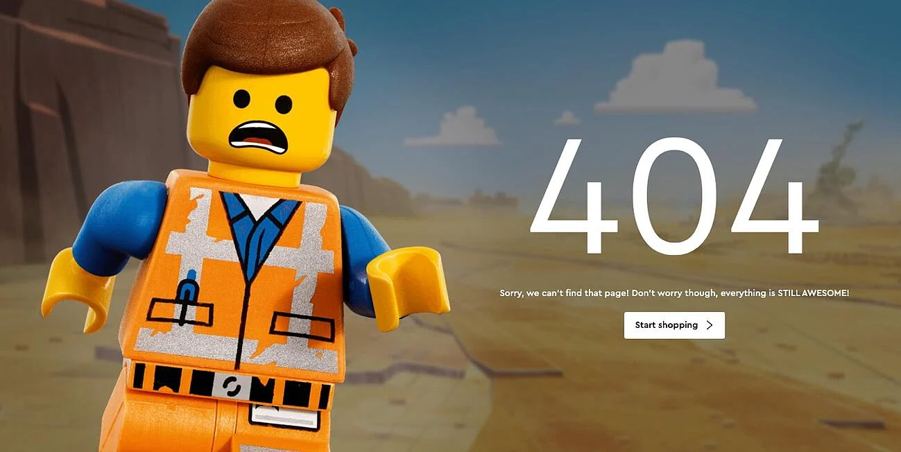 На странице ошибки 404 LEGO нужно несколько слов — выражение персонажа все проясняет. Кроме того, поклонникам фильмов LEGO понравится забавная ссылка в тексте.