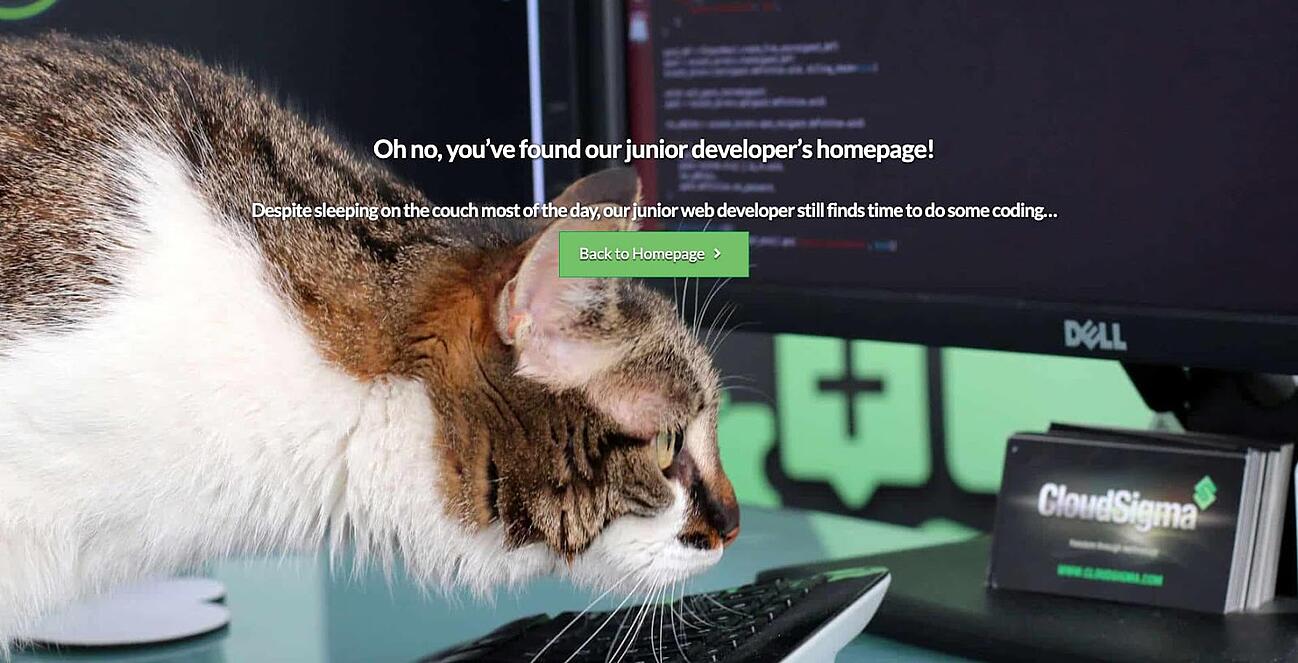 Cloud Sigma позволяет нам заглянуть за кулисы. Их страница с ошибкой 404 притворяется «домашней страницей младшего разработчика» — этот младший разработчик является, ну, в общем, котом.