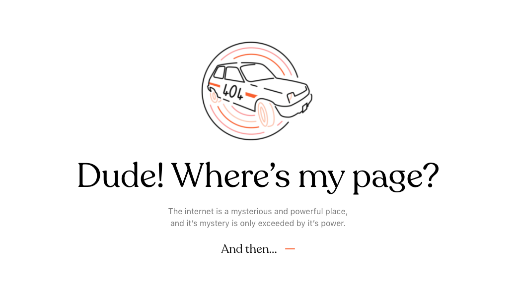Неслучайно креативные агентства отлично умеют придумывать классные страницы 404. Вот еще один от креативщиков Bruno, который разыгрывает культовую комедию 2000 года « Чувак, где моя машина?». Нет, это не имеет ничего общего с компанией или веб-сайтом, но обязательно вызовет смех.