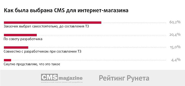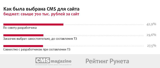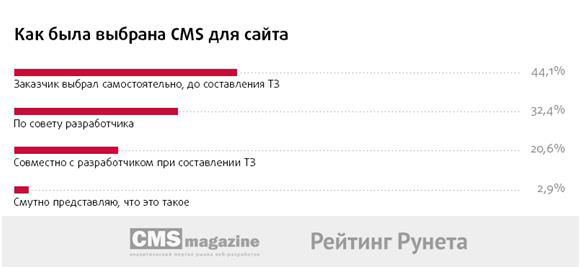 Больше половины доверились специалистам тех веб-студий, куда обратились с заказом на сайт. 55,9% сделали выбор по настоянию подрядчика. Не удивлён. Большинство не задумывается об этом вопросе. Считаю это правильным. Откуда нормальному человеку знать про особенности современных CMS?