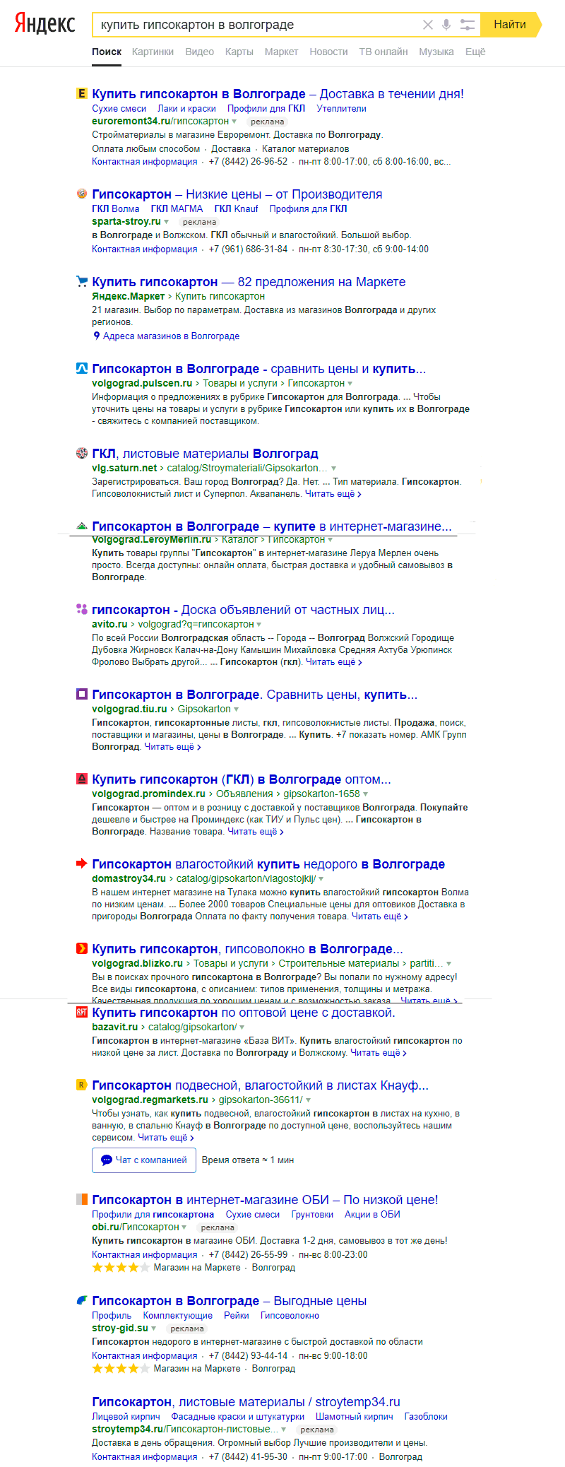 Странно... Попробую по другому. Спросил «купить гипсокартон в Волгограде»: