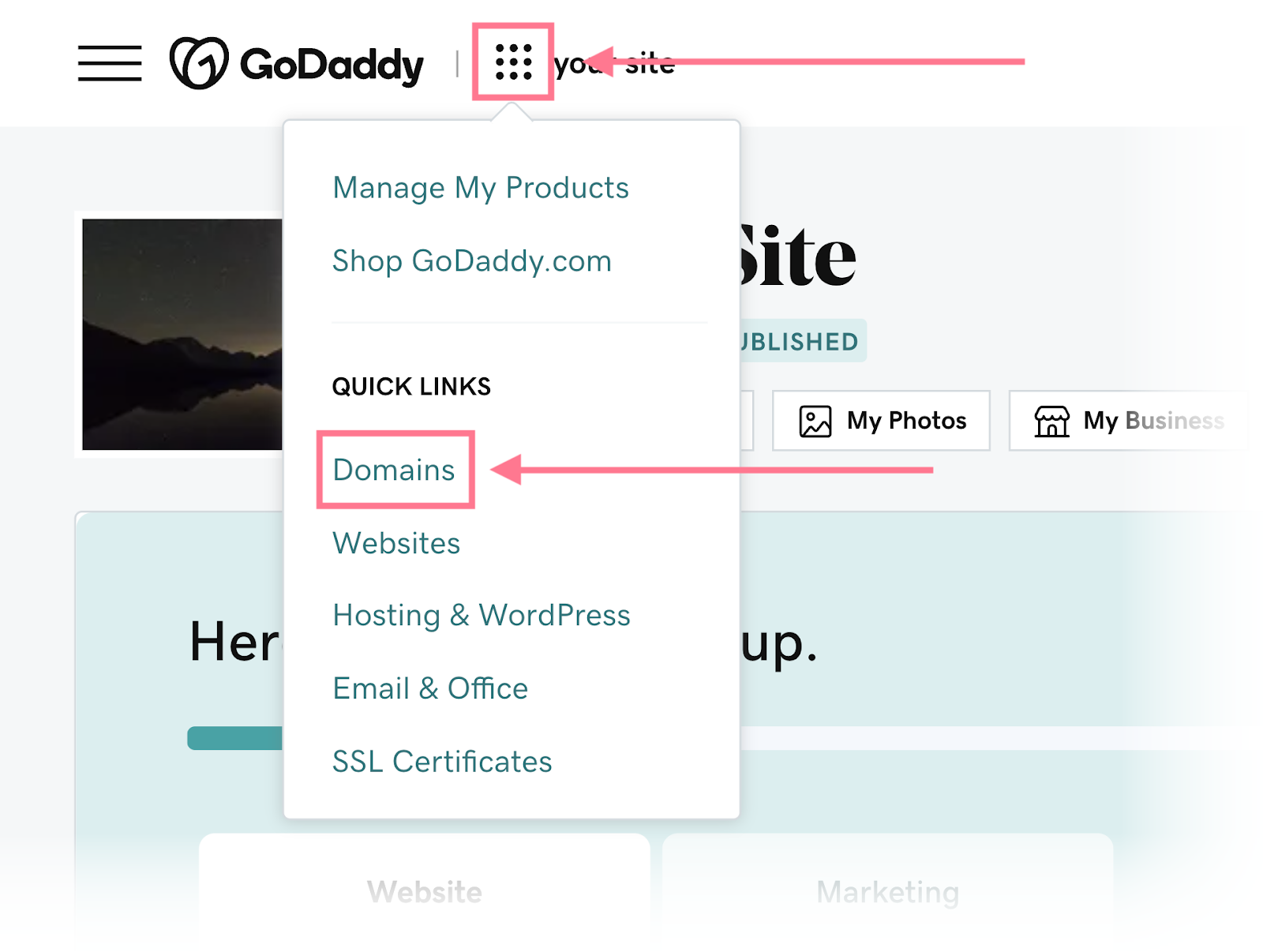 После входа в систему откройте настройки DNS, кликнув девять точек на панели навигации рядом с названием вашей компании. И выберите «Домены».