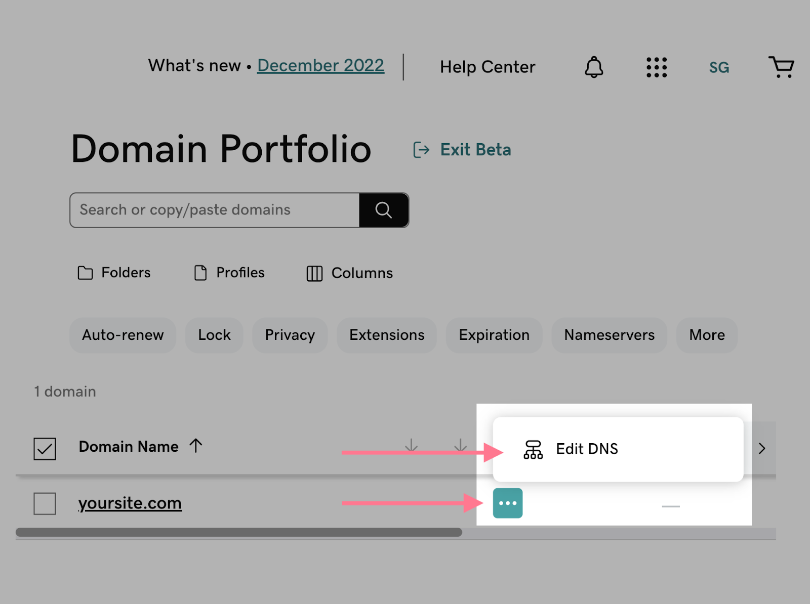 На панели управления доменами нажмите три точки рядом с вашим доменным именем и нажмите «Изменить DNS».