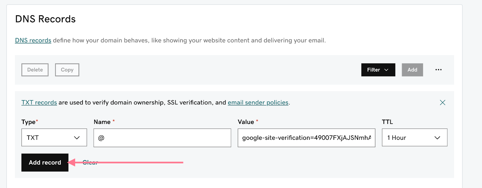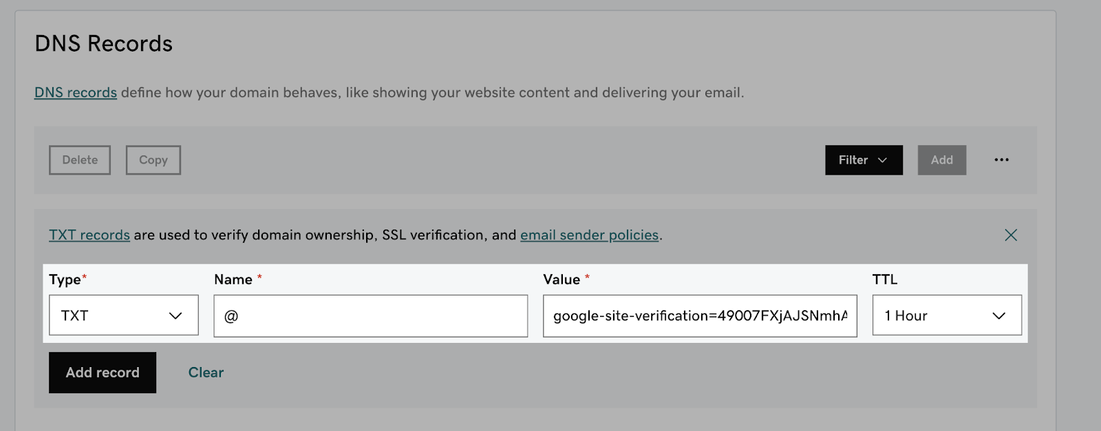 Если вы добавляете сайт этим способом, вам необходимо подтвердить домен через DNS. Вот как это происходит: