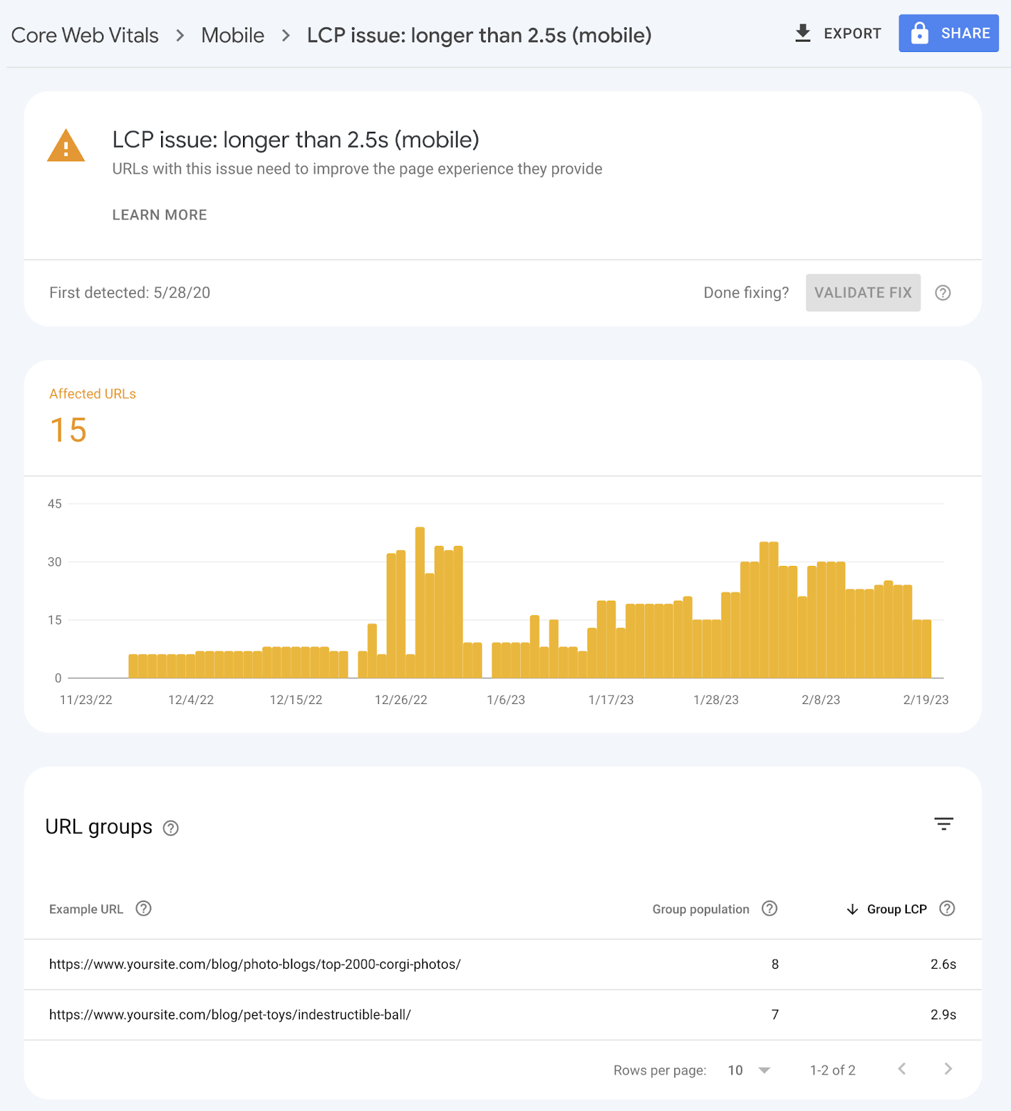 Нажмите на запись, чтобы увидеть, на каких страницах возникла проблема с LCP.