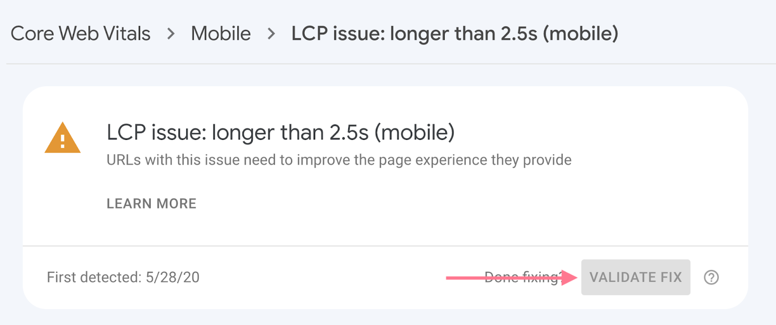 Устранив проблему, предупредите Google об изменении, нажав «ПРОВЕРИТЬ ИСПРАВЛЕНИЕ» в верхней части отчета об ошибке.