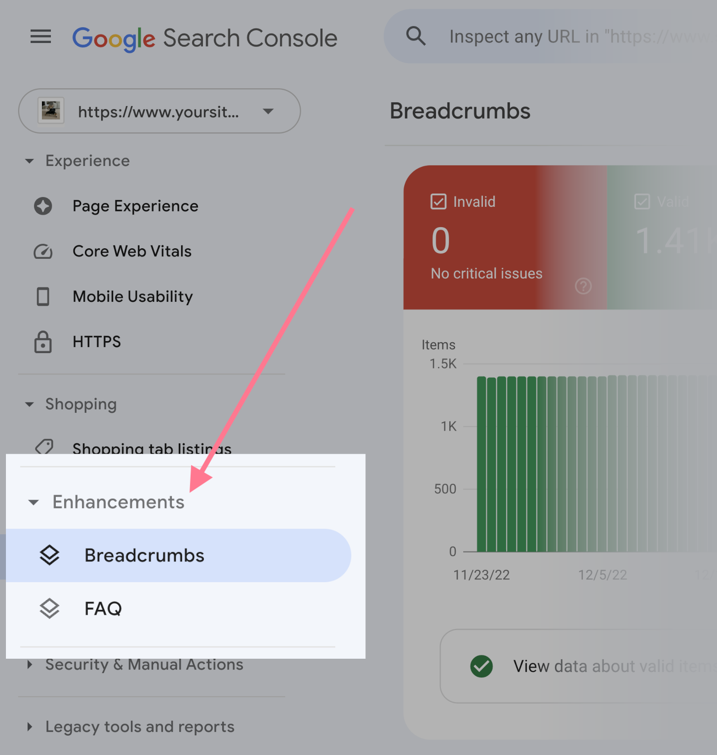 Google перечисляет типы структурированных данных, которые он обнаруживает, в разделе «Улучшения» на боковой панели.