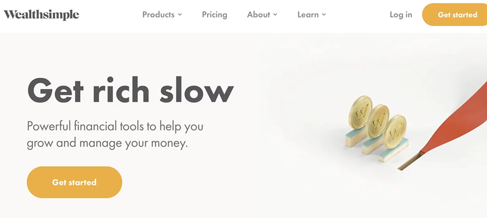 Инвестиции — сложная штука, но Wealthsimple объясняет процесс одной строкой: «Медленно разбогатейте». Эта фраза дает ощущение, что бренд говорит на вашем уровне, подразумевая, что они будут работать с вами бок о бок.