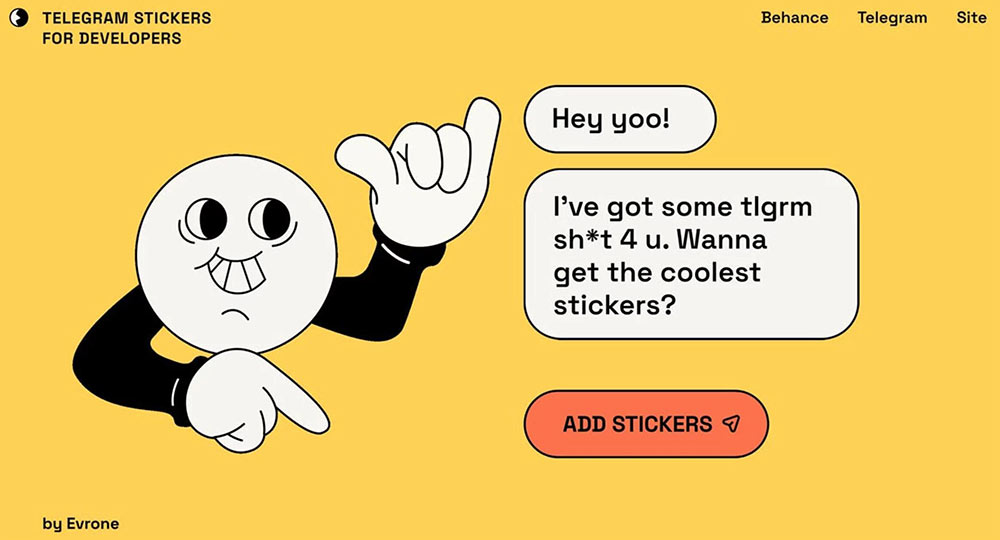 Эта целевая страница для набора стикеров Telegram использует (цензуру) ругательство с места в карьер. Его аудитория — разработчики, отрасль — технологии, — довольно случайны и открыты для ругательств, так что это работает.