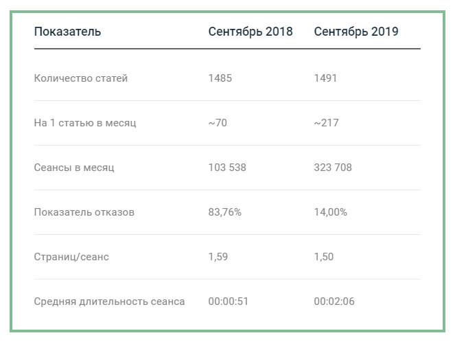 За последний год нам удалось в три раза увеличить среднюю посещаемость на одну статью в месяц и общий трафик на раздел. Вдобавок мы в шесть раз снизили показатель отказов и в два раза увеличили длительность сеанса (спасибо комментариям). При этом статей стали писать в десять раз меньше.