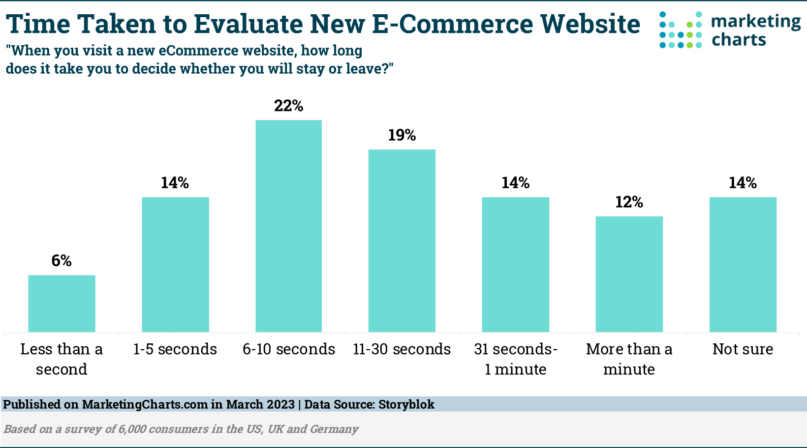 Опросив 6000 потребителей в США, Великобритании и Германии, Storyblok выяснил, что примерно одной пятой всех посетителей требуется 5 секунд или меньше, чтобы принять решение о том, останутся они или уйдут с нового для них интернет-магазина. Среди них 6% утверждают, что им требуется меньше секунды, чтобы принять решение.