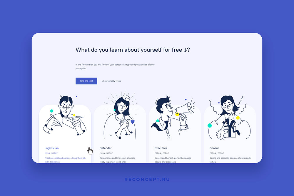 На сайте KPMI иллюстрации не только украшают, но и облегчают работу с интерфейсом. Платформа kpmi.ru поможет вам лучше узнать себя и найти работу, которая подходит вам по типу личности. Чтобы упростить этот процесс, мы разработали иллюстрации, которые подсказывают что именно происходит в экране и что делать дальше.