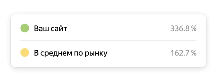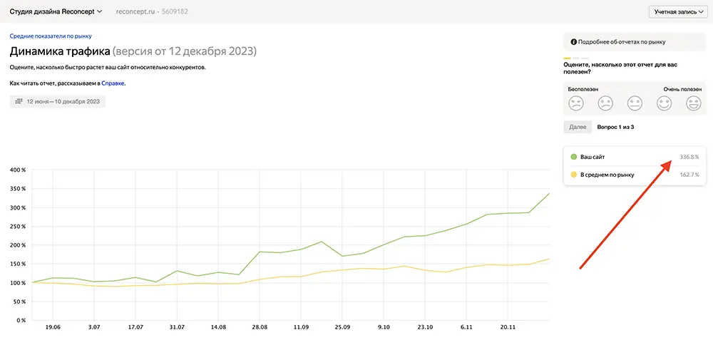 Мы продвигаем сайт статьями и Яндекс Метрика показала, что наш сайт наращивает поисковой трафик в 2 раза быстрее, чем в среднем по рынку! Вот скриншот из отчёта Метрики «Средние показатели по рынку» — «Динамика трафика»: