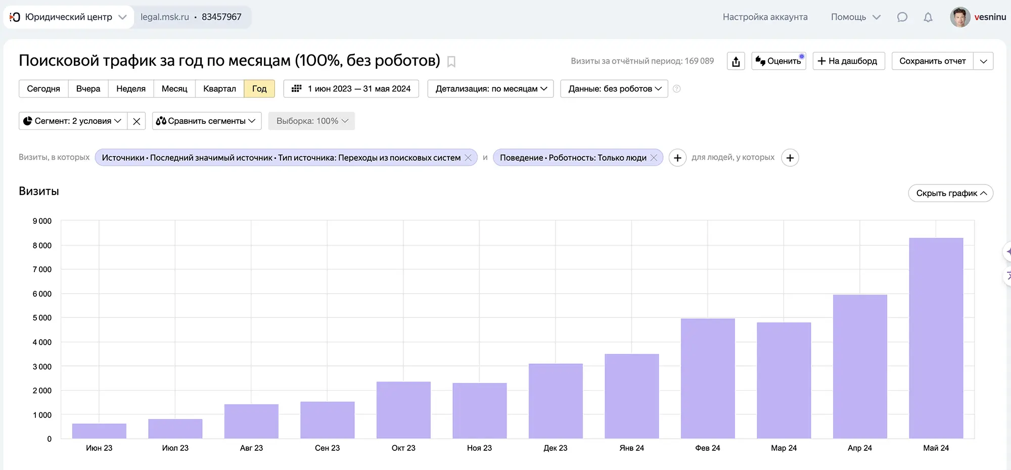 Каждый новый сайт решает одну и ту же проблему: как вырасти с нуля посетителей в день до сотен и тысяч. Посмотрите на график ниже. Вот как мы вырастили органику сайта юристов на 1200%: