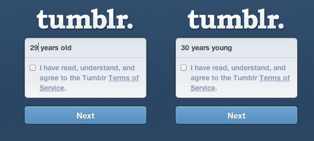 При регистрации пользователю предлагается указать свой возраст. Если в поле указывается число меньше тридцати, интерфейс отображает стандартную, грамматически верную фразу «I’m 29 years old». Если же пользователь старше, текст меняется на каламбурное «I’m 30 years young». Логика ясна: после этого рубежа возраст становится для многих больной темой, а в сообществе, где много молодежи и подростков, это чувство может обостриться. Игра слов должна позабавить и развеять пользователя, отвлекая его от неприятных переживаний. Если расчет верен, это удачная мысль. С другой стороны, тому, кто не особенно комплексует, это может показаться глупым кокетством, а кому-то слишком чувствительному — насмешкой.