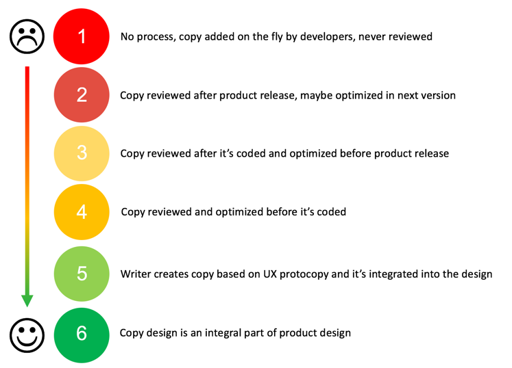 В теории с этим все, наверное, согласятся, однако на деле обычно выходит так, что в цикле разработки копирайтинг ютится где-то на задворках — если над ним вообще работают особо, то чаще всего как придется и когда придется. Энди Хили предлагает такую шкалу с градацией командной работы: