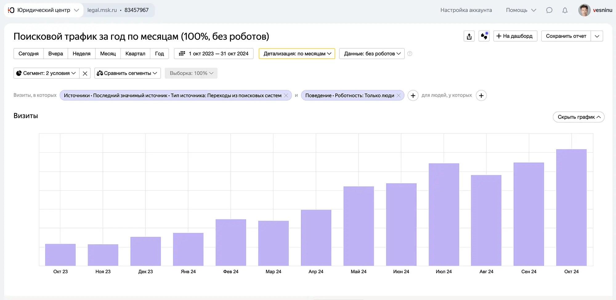 Например, юридическая компания из Москвы, блог которой я редактирую и курирую. Рост трафика — около 1000% в год.