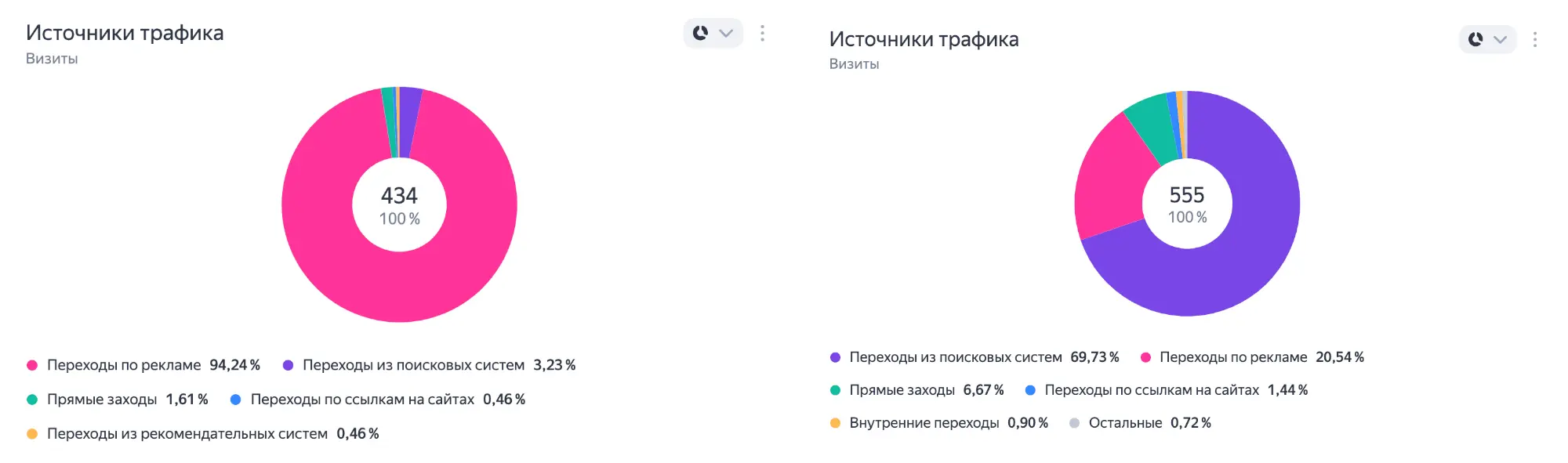 Слева вы видите с чего мы стартовали: 94% трафика из рекламы. Справа то, что мы сделали на сегодняшний день: поисковой трафик почти 70%! А было 3%.