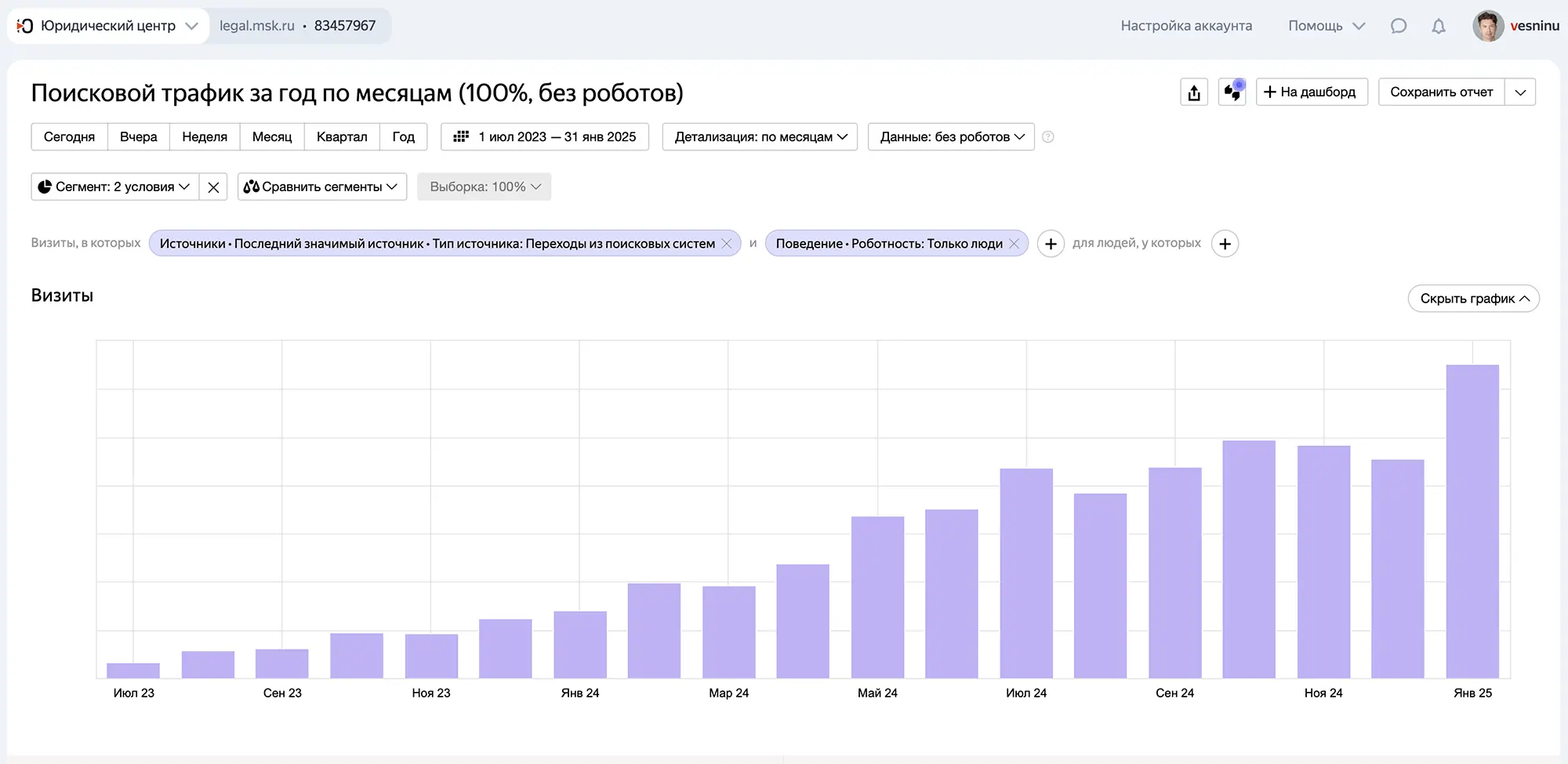Мы экспертно SEO-оптимизируем сайты и отдельные страницы. Результаты нашей работы говорят сами за себя. Это статистика нашего клиента, юридической компании.