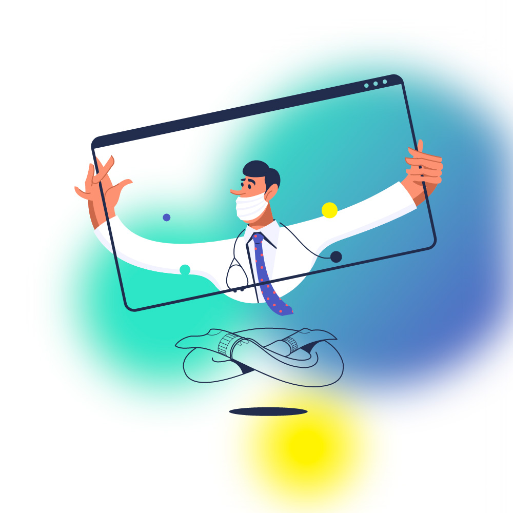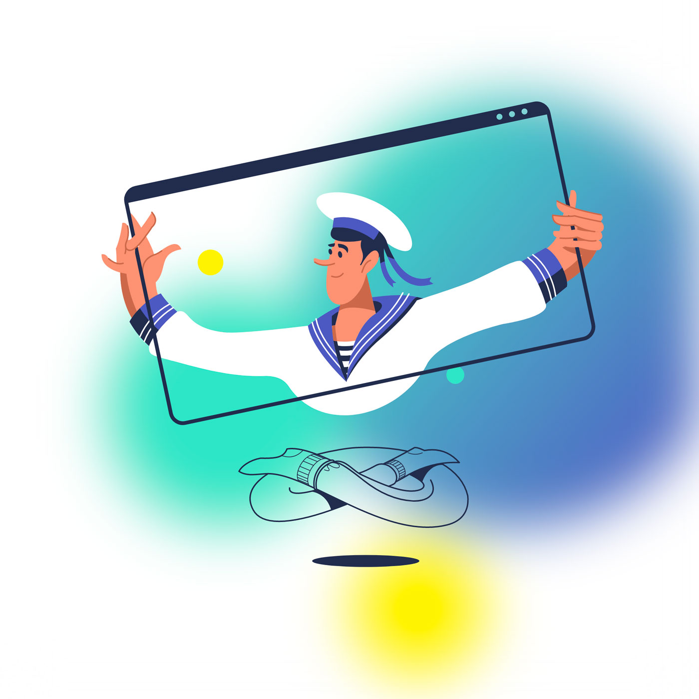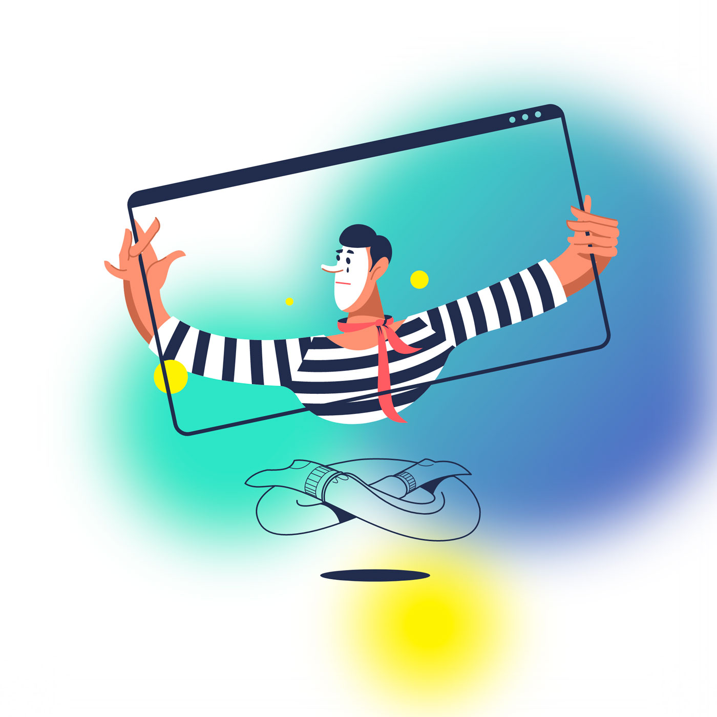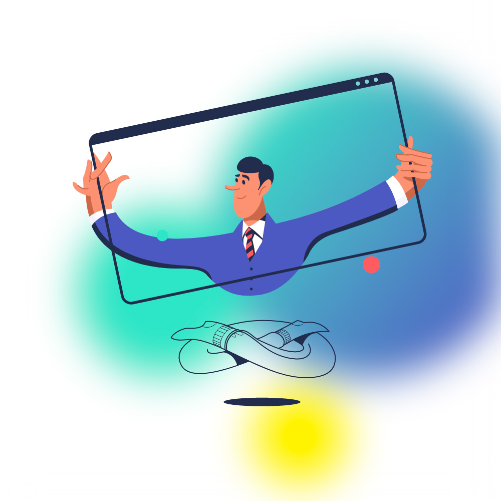 Для главной страницы был придуман парящий персонаж, который примеряет профессии.